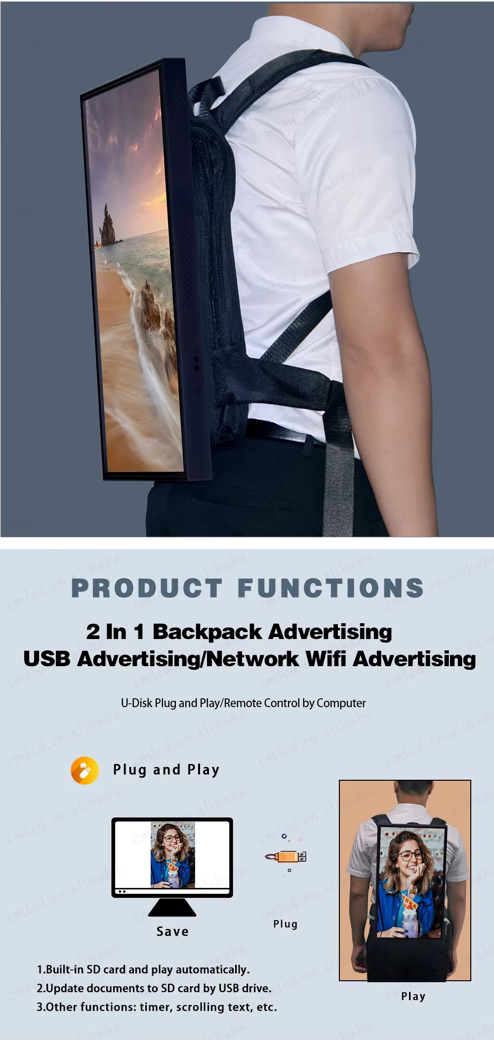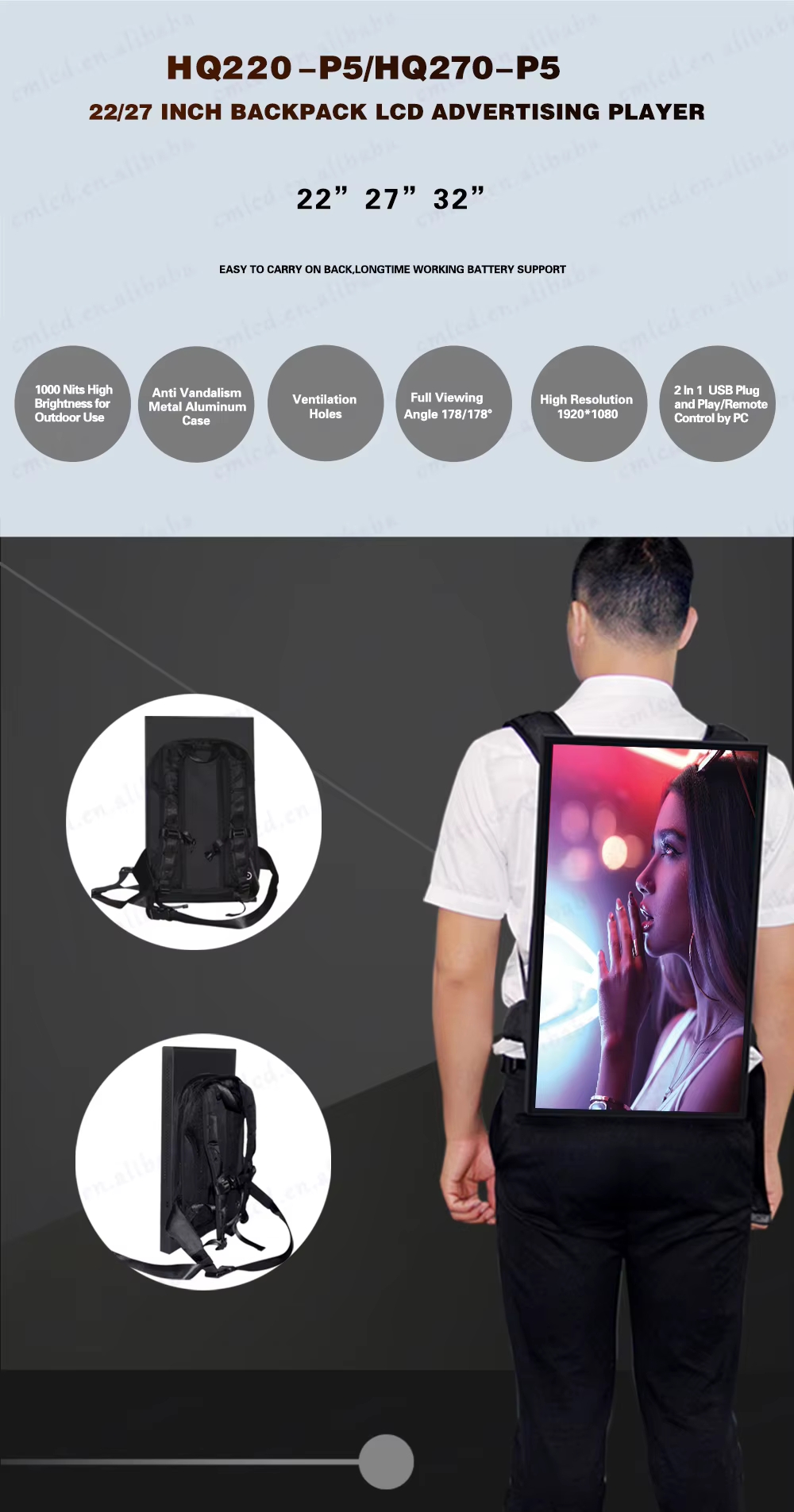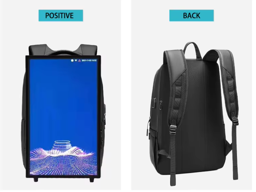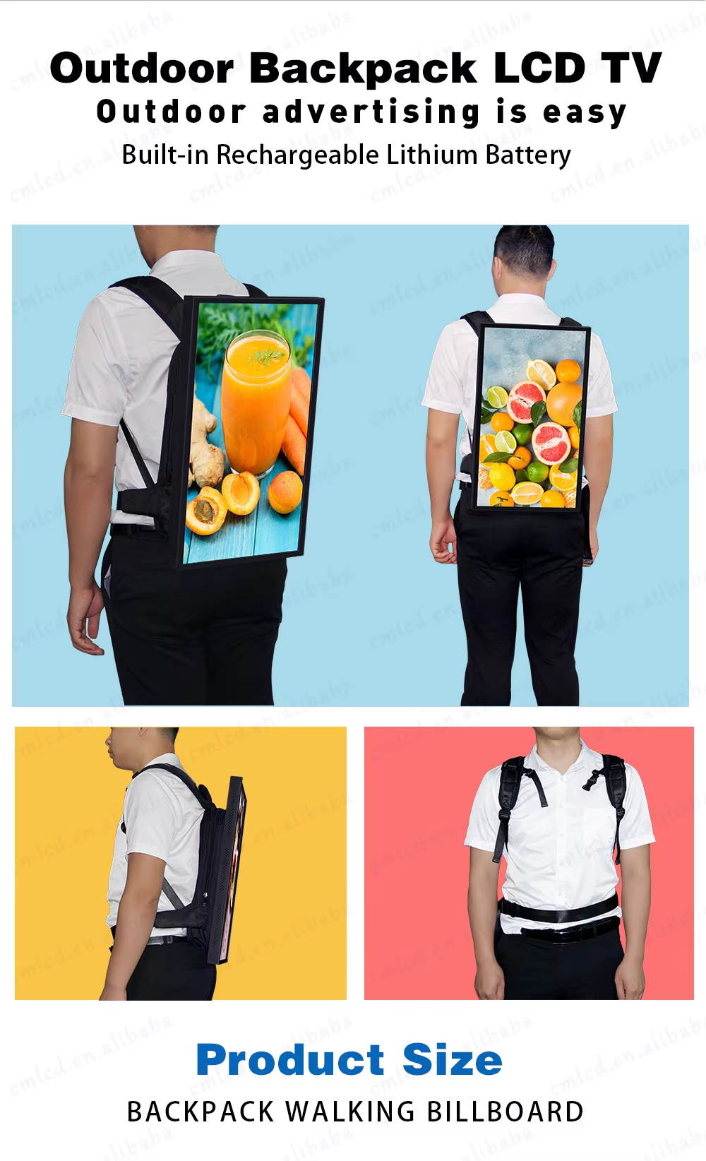 13.3-21.5-32 tommers ryggsekk LCD-skjerm med Power Bank, LED-ryggsekk Walker Billboard Walking Display LCD Mobile Digital Advertising Bag Advertising Machine Signage Portable Battery, hovedsakelig brukt i reklamepubliser.