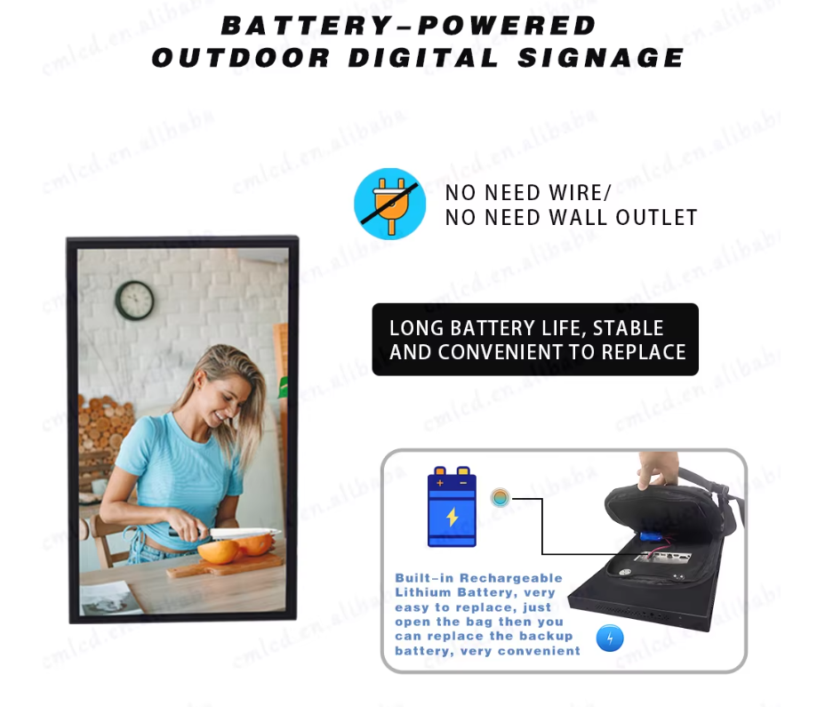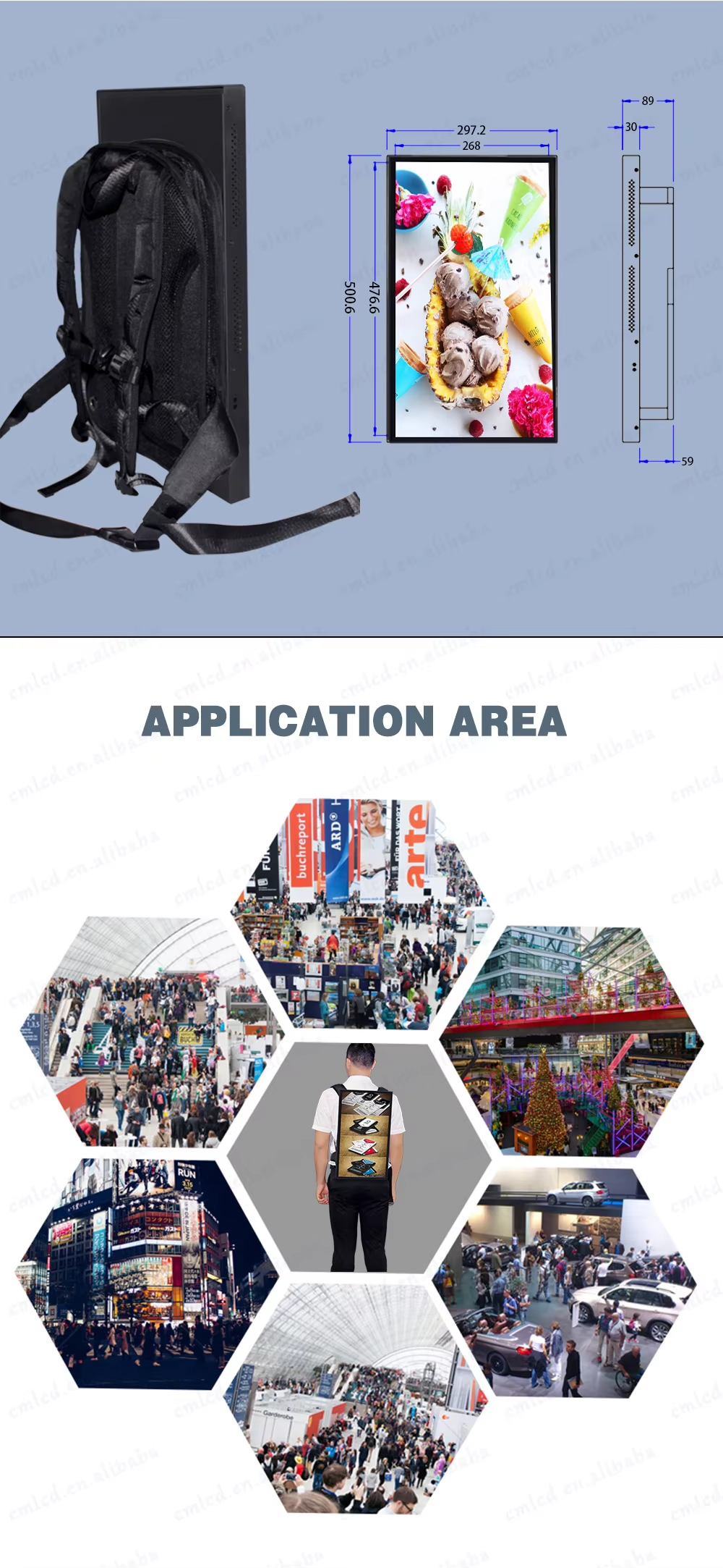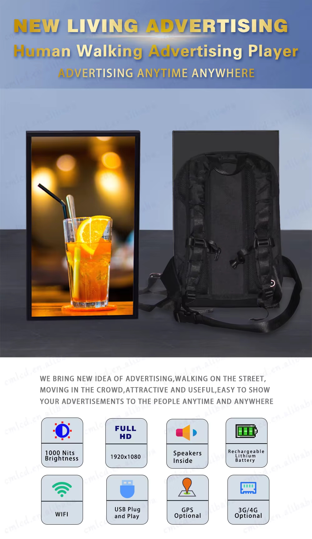 13.3-21.5-32 tommers ryggsekk LCD-skjerm med Power Bank, LED-ryggsekk Walker Billboard Walking Display LCD Mobile Digital Advertising Bag Advertising Machine Signage Portable Battery, hovedsakelig brukt i reklamepubliser.