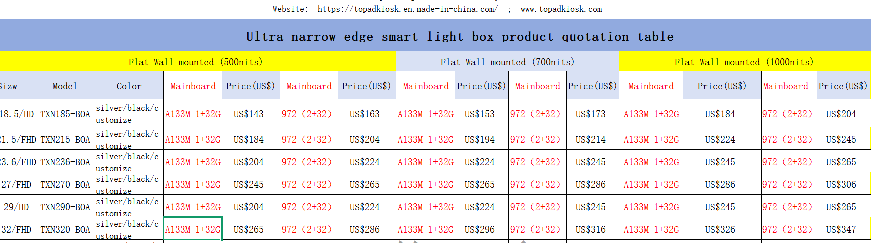 Leter du etter en pålitelig 4K smal ramme innendørs veggmontert digital skilting 1000nits for å imøtekomme dine forretningsbehov? Ikke se lenger enn Shenzhen Topadkiosk Display Technology Co., Ltd. Som en ledende produsent og leverandør med base i Kina, spesialiserer vi oss på å tilby digitale skiltingsprodukter og løsninger som er tilpasset forskjellige applikasjoner.